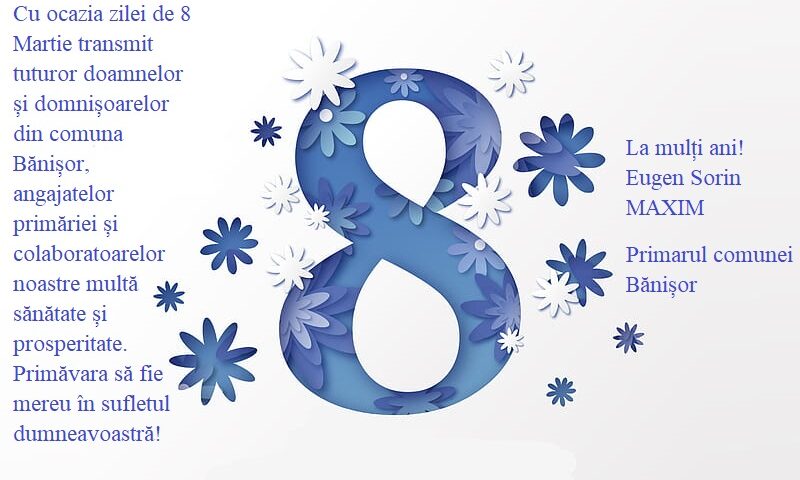 Cu ocazia zilei de 8 Martie transmit tuturor doamnelor și domnișoarelor din comuna Bănișor, angajatelor primăriei și colaboratoarelor noastre multă sănătate și prosperitate. Primăvara să fie mereu în sufletul dumneavoastră!