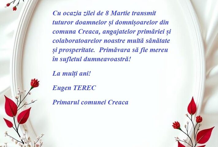 Cu ocazia zilei de 8 Martie transmit tuturor doamnelor și domnișoarelor din comuna Creaca, angajatelor primăriei și colaboratoarelor noastre multă sănătate și prosperitate. Primăvara să fie mereu în sufletul dumneavoastră!