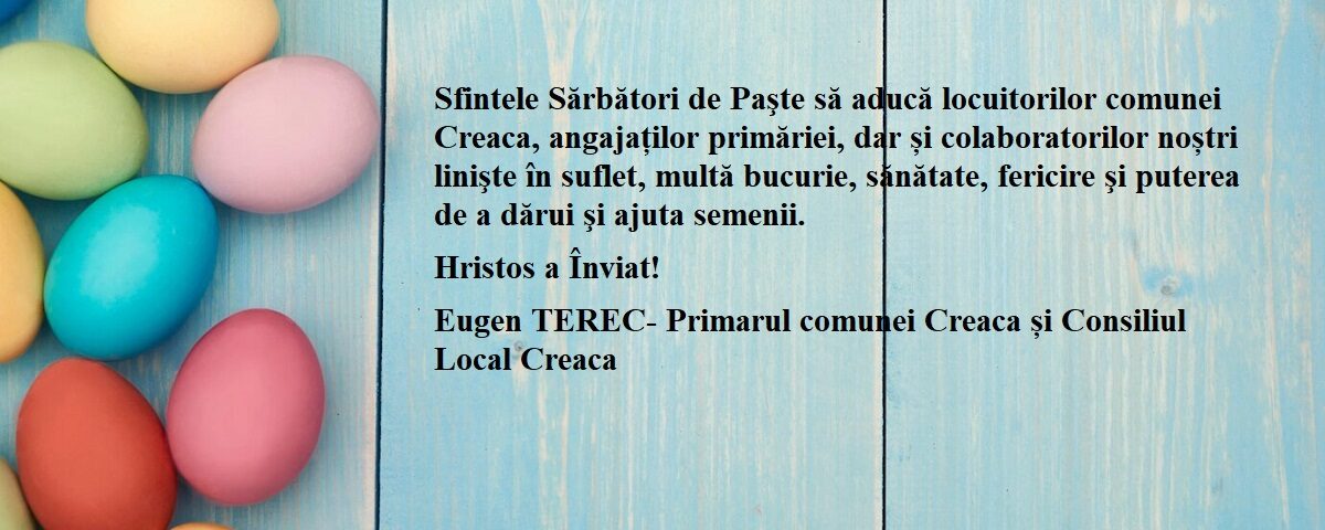Sfintele Sărbători de Paşte să aducă locuitorilor comunei Creaca, angajaților primăriei, dar și colaboratorilor noștri linişte în suflet, multă bucurie, sănătate, fericire şi puterea de a dărui şi ajuta semenii.