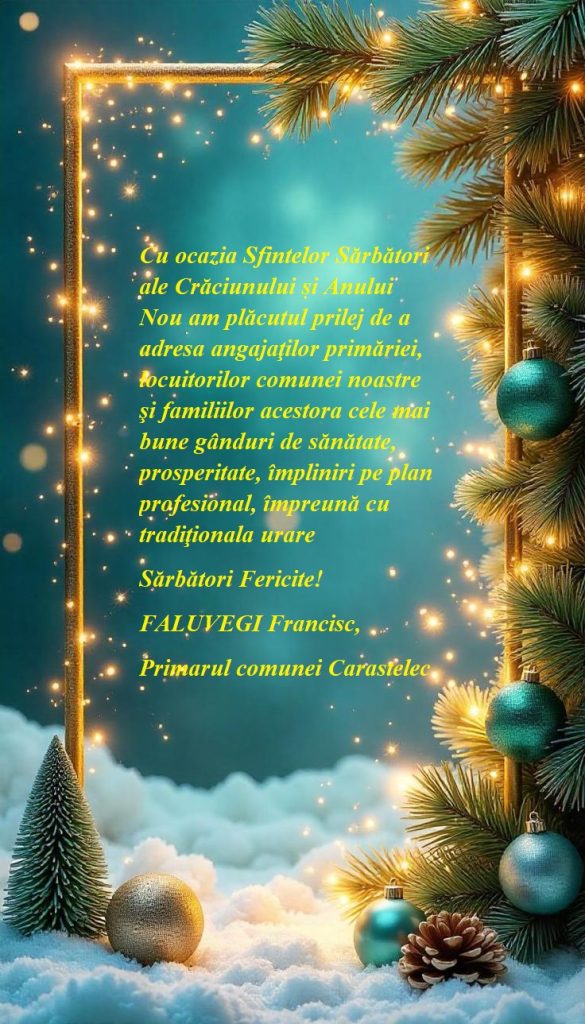 Cu ocazia Sfintelor Sărbători ale Crăciunului și Anului Nou am plăcutul prilej de a adresa angajaţilor primăriei, locuitorilor comunei noastre şi familiilor acestora cele mai bune gânduri de sănătate, prosperitate, împliniri pe plan profesional, împreună cu tradiţionala urare