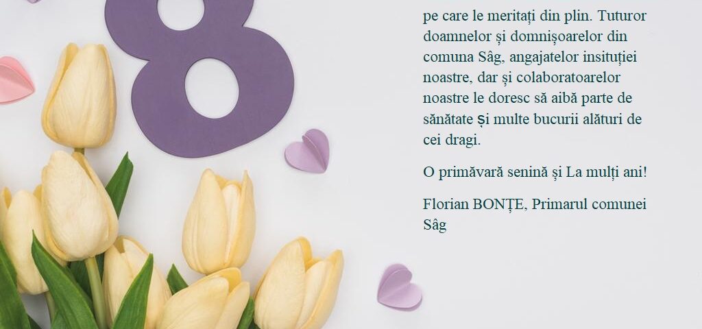 În acest început de primăvară vin din nou cu cele mai sincere felicitări pe care le meritați din plin. Tuturor doamnelor și domnișoarelor din comuna Sâg, angajatelor insituției noastre, dar și colaboratoarelor noastre le doresc să aibă parte de sănătate și multe bucurii alături de cei dragi.