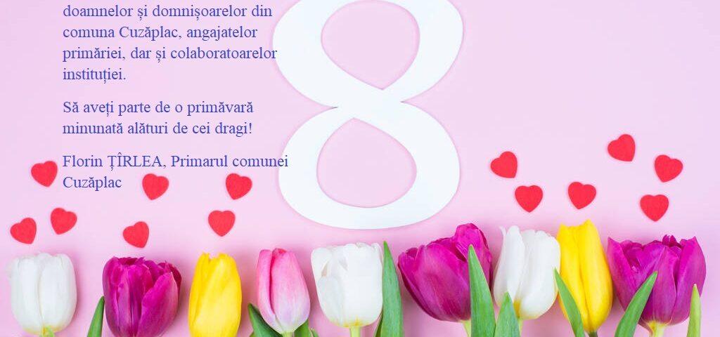 Cu prilejul zilei de 8 Martie adresez cele mai sincere urări de bine, sănătate și prosperitate tuturor doamnelor și domnișoarelor din comuna Cuzăplac, angajatelor primăriei, dar și colaboratoarelor instituției.