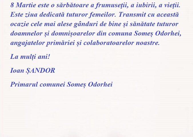 8 Martie este o sărbătoare a frumuseţii, a iubirii, a vieţii. Este ziua dedicată tuturor femeilor. Transmit cu această ocazie cele mai alese gânduri de bine și sănătate tuturor doamnelor și domnișoarelor din comuna Someș Odorhei, angajatelor primăriei și colaboratoarelor noastre.