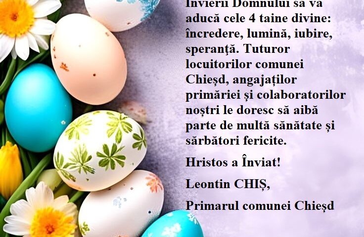 Fie ca sfânta sărbătoare a Învierii Domnului să vă aducă cele 4 taine divine: încredere, lumină, iubire, speranţă. Tuturor locuitorilor comunei Chieșd, angajaților primăriei și colaboratorilor noștri le doresc să aibă parte de multă sănătate și sărbători fericite.