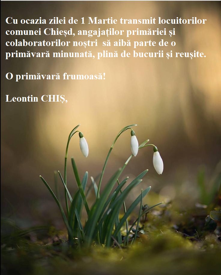 Cu ocazia zilei de 1 Martie transmit locuitorilor comunei Chieșd, angajaților primăriei și colaboratorilor noștri să aibă parte de o primăvară minunată, plină de bucurii și reușite.