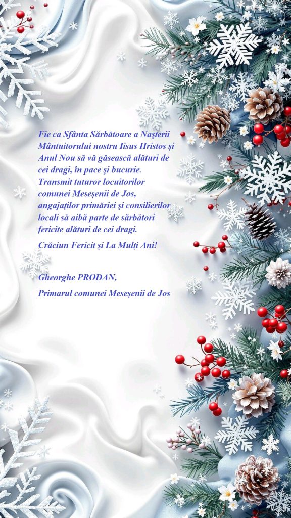 Fie ca Sfânta Sărbătoare a Naşterii Mântuitorului nostru Iisus Hristos și Anul Nou să vă găsească alături de cei dragi, în pace şi bucurie. Transmit tuturor locuitorilor comunei Bobota, angajaţilor primăriei şi consilierilor locali să aibă parte de sărbători fericite alături de cei dragi.