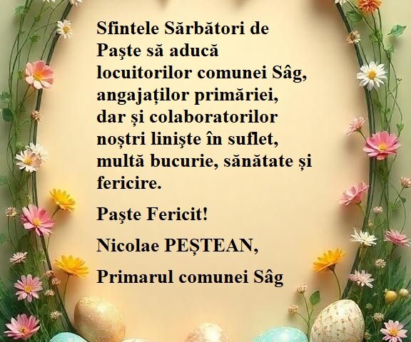 Sfintele Sărbători de Paşte să aducă locuitorilor comunei Sâg, angajaților primăriei, dar și colaboratorilor noștri linişte în suflet, multă bucurie, sănătate și fericire. Paşte Fericit! Nicolae PEȘTEAN, Primarul comunei Sâg