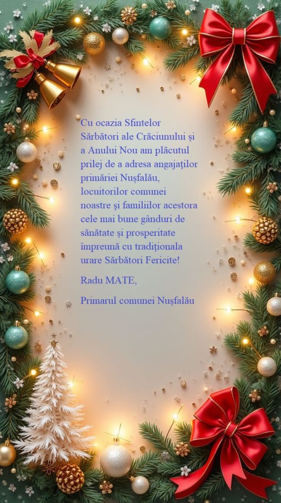 Cu ocazia Sfintelor Sărbători ale Crăciunului și a Anului Nou am plăcutul prilej de a adresa angajaţilor primăriei Nușfalău, locuitorilor comunei noastre şi familiilor acestora cele mai bune gânduri de sănătate și prosperitate împreună cu tradiţionala urare Sărbători Fericite!