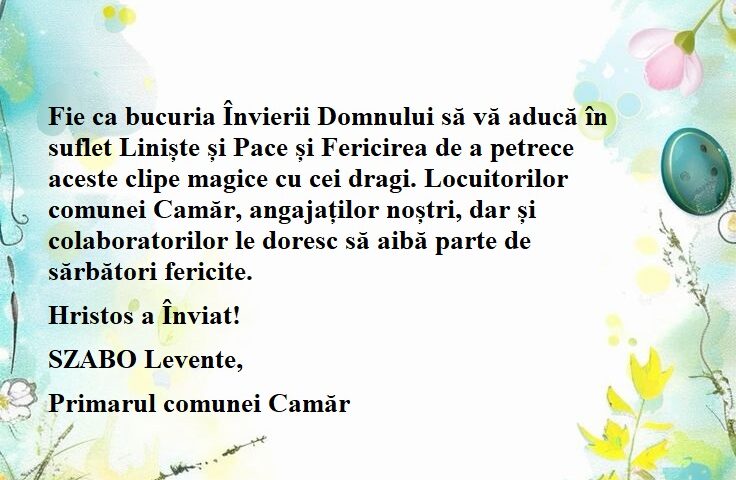 Fie ca bucuria Învierii Domnului să vă aducă în suflet Liniște și Pace și Fericirea de a petrece aceste clipe magice cu cei dragi. Locuitorilor comunei Camăr, angajaților noștri, dar și colaboratorilor le doresc să aibă parte de sărbători fericite.