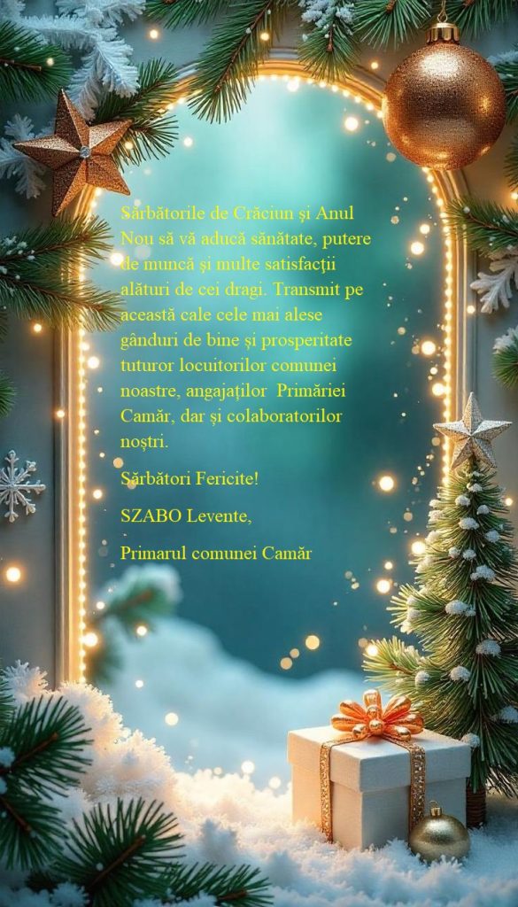 Sărbătorile de Crăciun şi Anul Nou să vă aducă sănătate, putere de muncă şi multe satisfacţii alături de cei dragi. Transmit pe această cale cele mai alese gânduri de bine și prosperitate tuturor locuitorilor comunei noastre, angajaților Primăriei Camăr, dar și colaboratorilor noștri.
