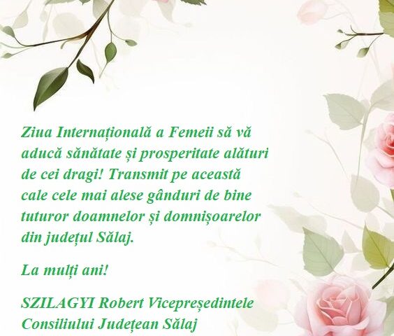 Ziua Internațională a Femeii să vă aducă sănătate și prosperitate alături de cei dragi! Transmit pe această cale cele mai alese gânduri de bine tuturor doamnelor și domnișoarelor din județul Sălaj.