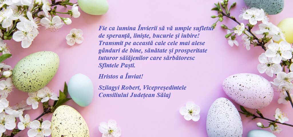 Fie ca lumina Învierii să vă umple sufletul de speranţă, linişte, bucurie şi iubire! Transmit pe această cale cele mai alese gânduri de bine, sănătate și prosperitate tuturor sălăjenilor care sărbătoresc Sfintele Paști.