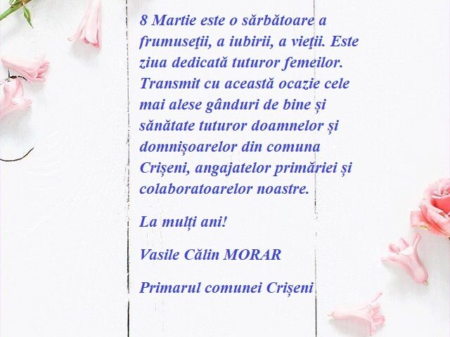 8 Martie este o sărbătoare a frumuseţii, a iubirii, a vieţii. Este ziua dedicată tuturor femeilor. Transmit cu această ocazie cele mai alese gânduri de bine și sănătate tuturor doamnelor și domnișoarelor din comuna Crișeni, angajatelor primăriei și colaboratoarelor noastre.