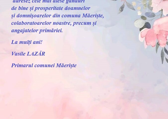 Cu ocazia zilei de 8 Martie, Ziua Internaţională a Femeii, adresez cele mai alese gânduri de bine și prosperitate doamnelor și domnişoarelor din comuna Măeriște, colaboratoarelor noastre, precum și angajatelor primăriei.