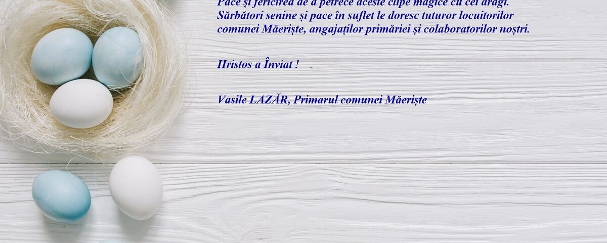 Fie ca bucuria Învierii Domnului să vă aducă în suflet Liniște și Pace și fericirea de a petrece aceste clipe magice cu cei dragi. Sărbători senine și pace în suflet le doresc tuturor locuitorilor comunei Măeriște, angajaților primăriei și colaboratorilor noștri.