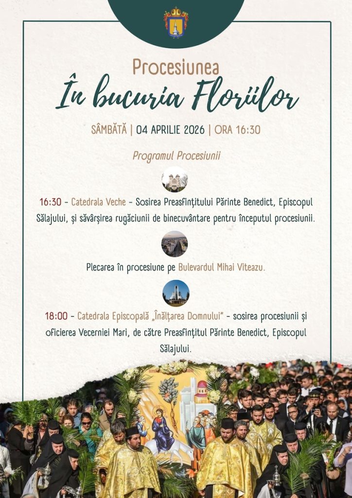 Sâmbătă, 4 aprilie, în intervalul orar 16:30-18:00, se va desfășura procesiunea „În bucuria Floriilor”, organizată de Episcopia Sălajului, pe următorul traseu: Catedrala „Adormirea Maicii Domnului”, str. 9 Mai, Piața 1 Decembrie 1918, Bdul Mihai Viteazul – sens giratoriu spre Kaufland, str. Sfânta Vineri, Parohia Sfânta Vineri.