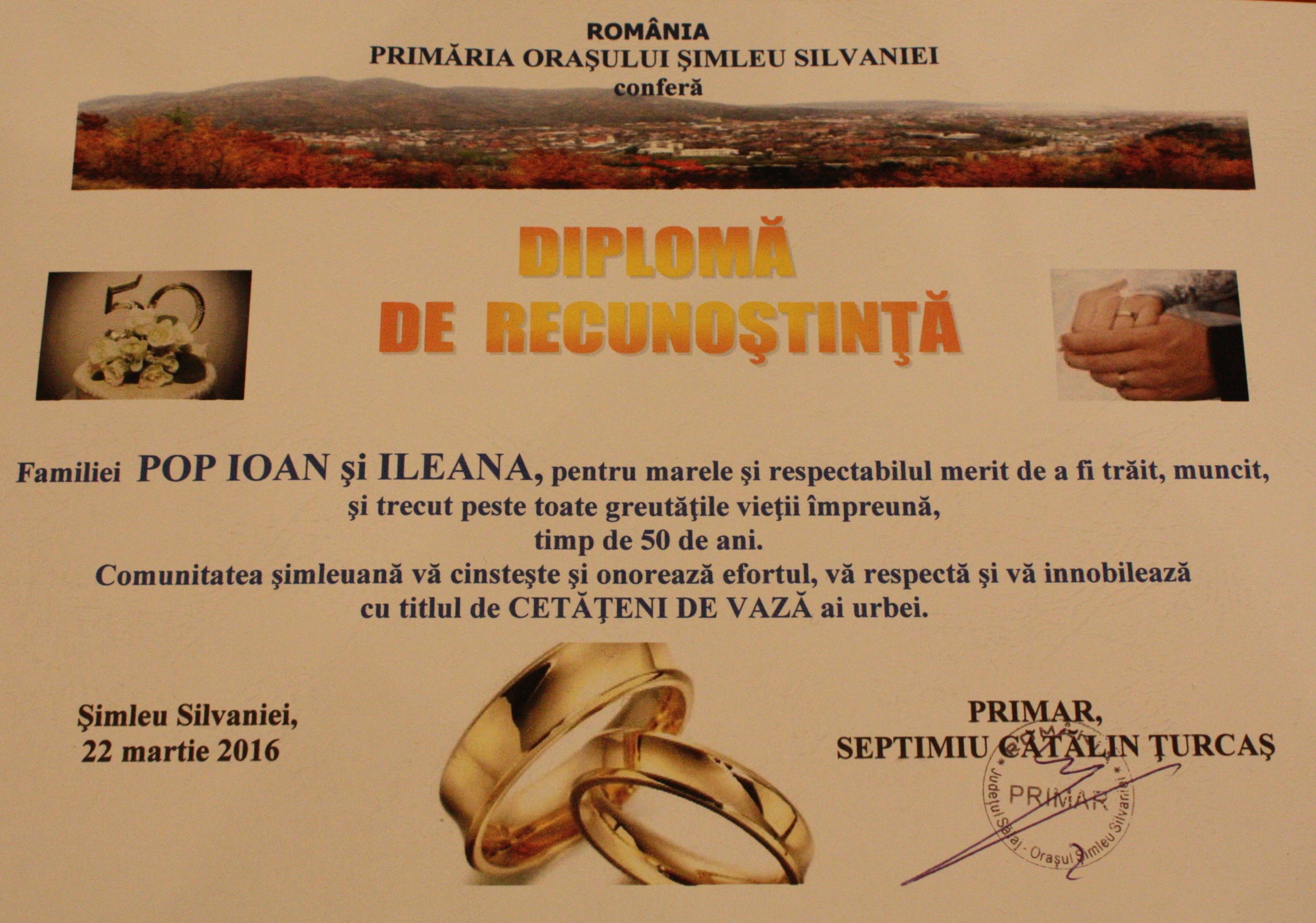 Septimiu CătălinŢurcaş, primarul localităţii Șimleu Silvaniei a declarat: „Mă bucur că avem această ocazie să-i sărbătorim pe cei care au împlinit 50 de ani de convieţuire împreună. Sunt oamenii care au trecut în viaţă peste bune, peste rele şi suntem mândri de ei. Vă arătăm respectul și aprecierea pentru tot ce ați realizat în familie și ca oameni, dovedind astfel că reprezentați adevărate exemple de viață pentru noi.”