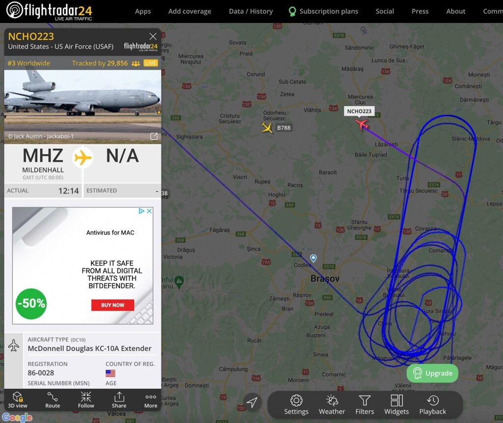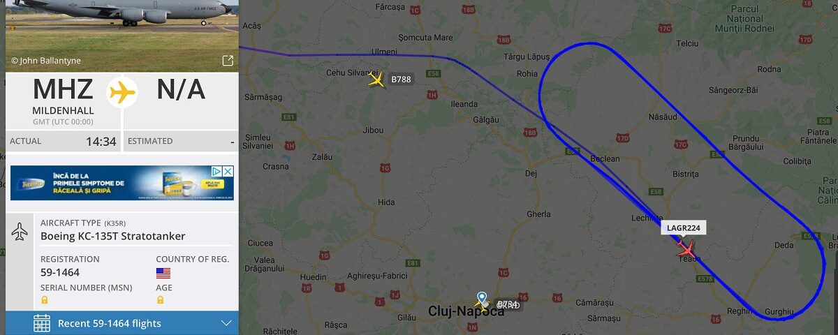 Joi o aeronava cisterna a survolat spatiul aerian din Salaj si se pare ca a alimentat un avion pe spatiul aerian deasupra judetului Bistrita Nasaud. Conform celor de la Flightradar avionul cisterna a decolat din Marea Britanie. A doua aeronava cisterna a survolat in apropiere de Tulcea, deasupra marii negre si a treia deasupra Odorheiului Secuiesc.