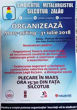 incepand cu ora 15:30. Acestia vor pleca din fata Silcotub si se vor opri pe platoul din fata Prefecturii Salaj. Sindicatul Metalurgistul Silcotub cere ca patronatul sa recunoasca conditiile de munca din metalurgie printr-o salarizare corecta si deblocarea si incheierea contractelor colective de munca prin modificarea legii 62/2011, a dialogului social.