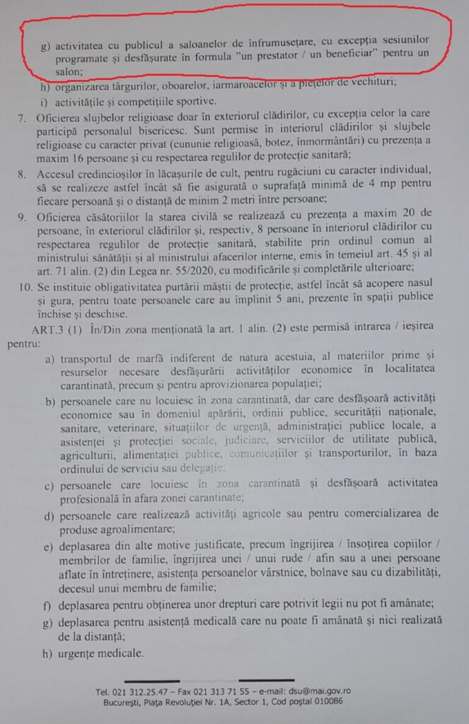 Arafat a semnat in data de 15.11.2020 ordinul prin care localitatea Criseni intra in carantina si se pare ca la Art2, punctul 6, nr G apare ca: „Interzicerea desfasurarii urmatoarelor activitati: activitatea cu publicul a saloanelor de infrumusetare, cu exceptia sesiunilor programate si desfasurate in formula un prestatator/un beneficiar pentru un salon” Poate nu intelegem noi, dar acum se inchid sau nu se inchid. Si pana acum saloanele functionau pe baza de programare si este clar ca este o decizie discriminatorie deoarece la doar 10km, in Zalau toate saloanele au fost inchise pe o perioada de 14 zile. Oare sa se inchida, sau sa nu se inchida, sau sa se inchida?