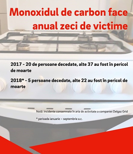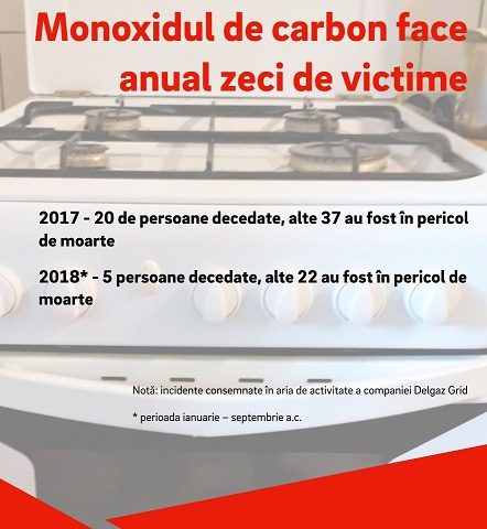Numai în primele nouã luni ale acestui an s-au înregistrat deja în zona de activitate a Delgaz Grid un numãr de 15 cazuri de intoxicaþii, care s-au soldat cu 5 persoane decedate în timp ce alte 22 au fost la un pas de a-ºi pierde viaþa. Asta dupã ce, anul trecut, 20 de persoane ºi-au pierdut viaþa prin asfixie, iar alte 37 au fost în pericol de moarte din cauza monoxidului de carbon acumulat în încãperi, în principal ca urmare a neevacuãrii sau evacuãrii insuficiente a gazelor arse.