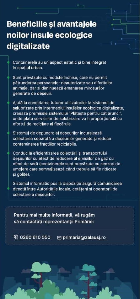 Primăria Municipiului Zalău a distribuit proprietarilor de apartamente carduri cu care au acces la insula ecologică digitalizată. Accesul la aceste module se realizează prin intermediul cardului doar de către persoanele arondate la acea insulă ecologică digitalizată. Persoanele care până la această dată nu au și-au ridicat cartelele, le pot prelua de la sediul Primăriei Zalău, Serviciul Managementul Proiectelor.