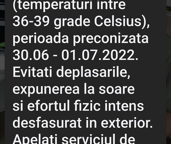 Joi salajenii au fost instiintati prin RoAlert ca este Cod Rosu de Canicula si autoritatile recomanda sa se evite depasarile inafara locuintei sau efortul fizic in aer liber. In perioada urmatoare vor veni ploile, conform celor de la meteo, dar asta incepand de sambata.