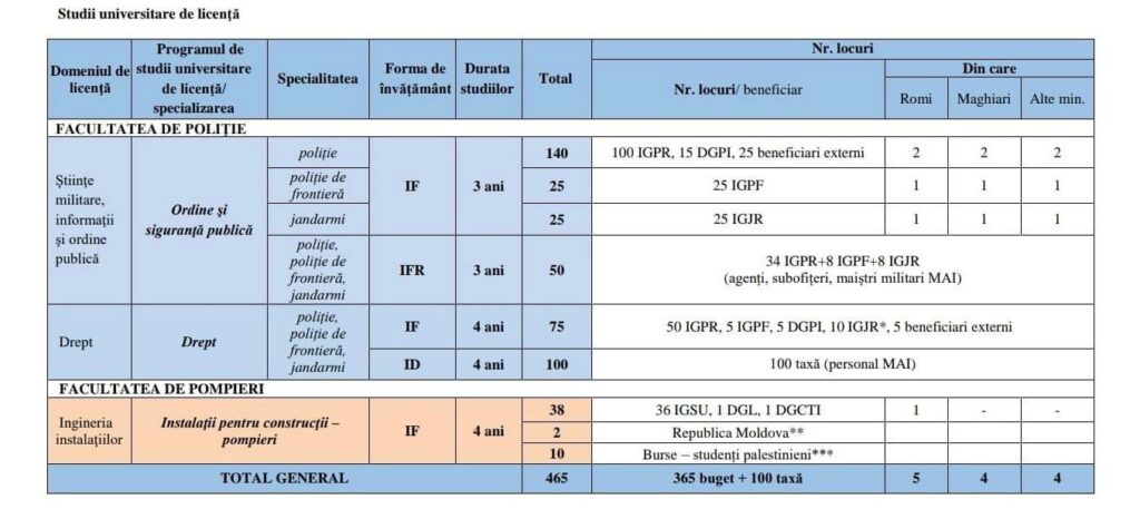 Menționăm că, anul acesta, la Academia de Poliție „Alexandru Ioan Cuza”, la Facultatea de Poliție, programul de studii „Ordine și siguranță publică” au fost scoase la concurs, la învățământ cu frecvență, 140 de locuri la specialitatea poliție, 25 pentru poliție de frontieră și 25 specialitatea jandarmi, iar la învățământ cu frecvență redusă, pentru cele 3 specializări au fost scoase 50 de locuri. Pentru programul de studii universitare „Drept”, specializările poliție, poliție de frontieră, jandarmi au fost scoase la concurs 75 de locuri pentru forma de învățământ cu frecvență și 100 pentru învățământ la distanță.