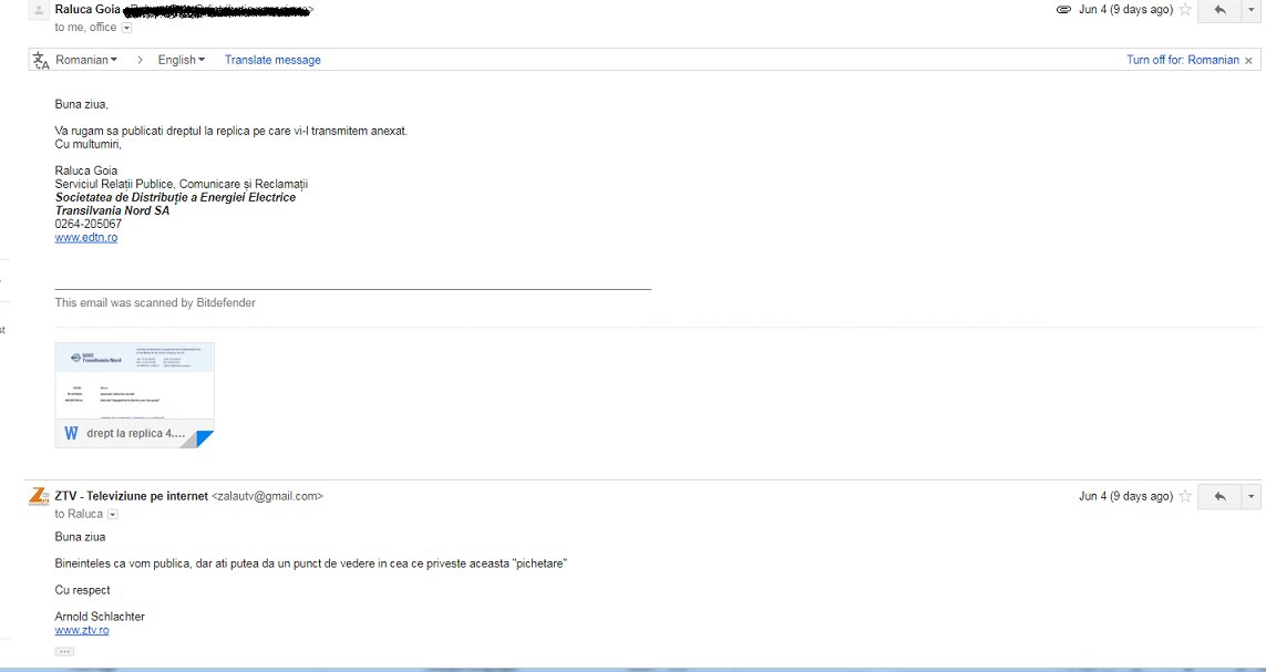 Dorim sã precizãm cã, ȋn spiritul transparenței de care a dat dovadã în relația cu reprezentanții mass-media, Electrica a rãspuns cu promptitudine tuturor solicitãrilor de informații, furnizând nu doar rãspunsuri clare ºi punctuale, ci transmițând permanent și proactiv informații referitoare la orice subiect care privește SDEE Transilvania Nord.
