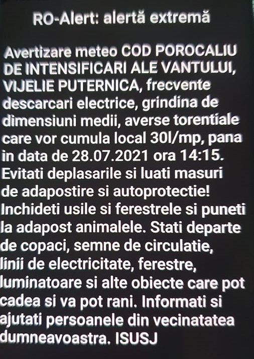 Interval de validitate: 2021-Jul-28 13:00 -> 2021-Jul-28 14:00 Fenomene meteorologice asteptate: vijelie puternică, grindină de dimensiuni medii, frecvente descărcări electrice, averse torenţiale care vor depăşi 25…30 l/mp Județul Sălaj: Zalău, Șimleu Silvaniei, Jibou, Cehu Silvaniei, Șărmășag, Crasna, Bălan, Surduc, Bobota, Pericei, Ip, Hereclean, Nușfalău, Măeriște, Sâg, Bocșa, Valcău de Jos, Creaca, Someș-Odorhei, Sălățig, Horoatu Crasnei, Năpradea, Meseșenii de Jos, Chieșd, Bănișor, Cizer, Letca, Vârșolț, Băbeni, Mirșid, Crișeni, Camăr, Benesat, Dobrin, Boghiș, Cristolț, Șamșud, Coșeiu, Carastelec