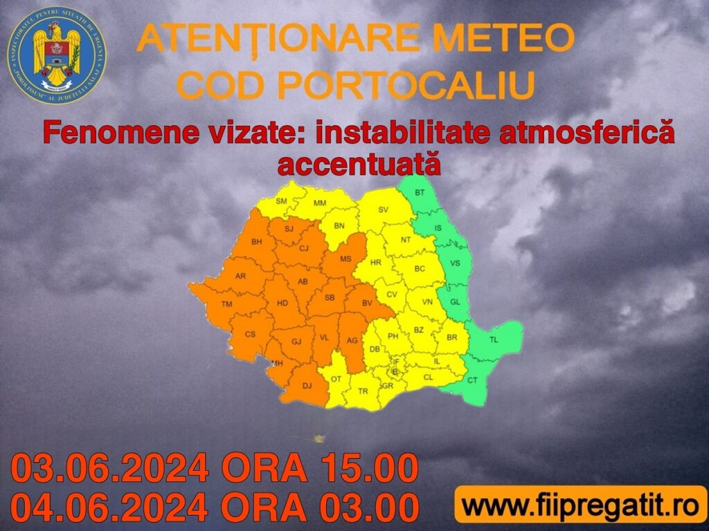 Astăzi, 3 iunie, începând cu ora 15:00, județul Sălaj se va afla sub incidența avertizării meteorologice COD PORTOCALIU de instabilitate atmosferică accentuată, valabilă până mâine dimineață, la ora 03:00, conform informării transmise de către Administraţia Naţională de Meteorologie.