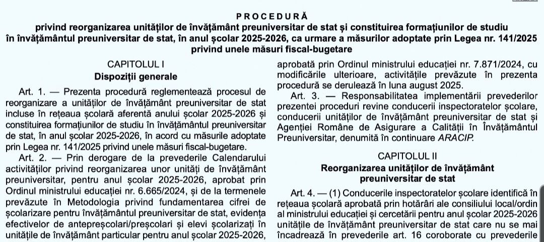 🗓 25 august 2025 – ARACIP transmite inspectoratelor ordinele ministrului privind aprobarea reorganizării școlilor.