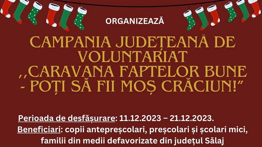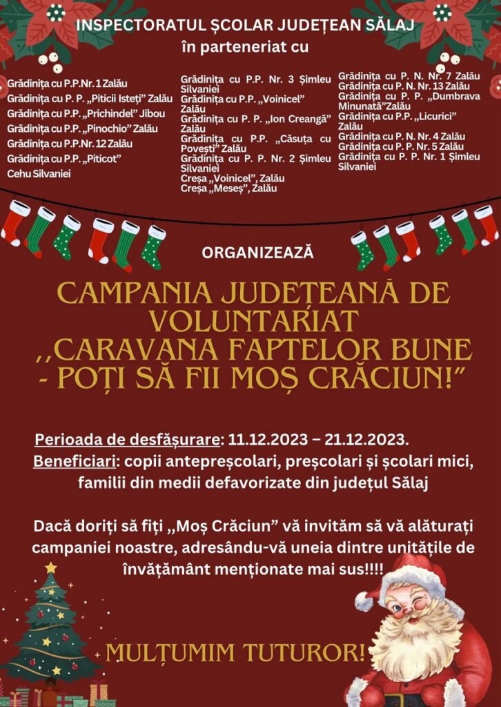Inspectoratul Școlar Județean Sălaj organizează, în perioada 6 – 21 decembrie 2023, Campania județeană de voluntariat ,,CARAVANA FAPTELOR BUNE – POȚI SĂ FII MOȘ CRĂCIUN”, în parteneriat cu grădinițele din Municipiul Zalău, din orașele Jibou, Cehu Silvaniei și Șimleu Silvaniei. În desfășurarea activităților vor fi implicați cca. 3000 antepreșcolari/preșcolari/ școlari din clasele primare din unitățile de învățământ sălăjene, aproximativ 400 cadre didactice, peste 3000 părinți, dar și reprezentanți ai comunității locale. Toate produsele alimentare (alimente, fructe, legume, dulciuri etc.) și nealimentare (îmbrăcăminte, încălțăminte, jucării, decorațiuni, produse de curățenie, produse de igienă etc.) vor ajunge la beneficiari, aceștia fiind antepreșcolarii, preșcolarii, școlarii mici, familiile/persoanele defavorizate, copiii din casele de tip familial.