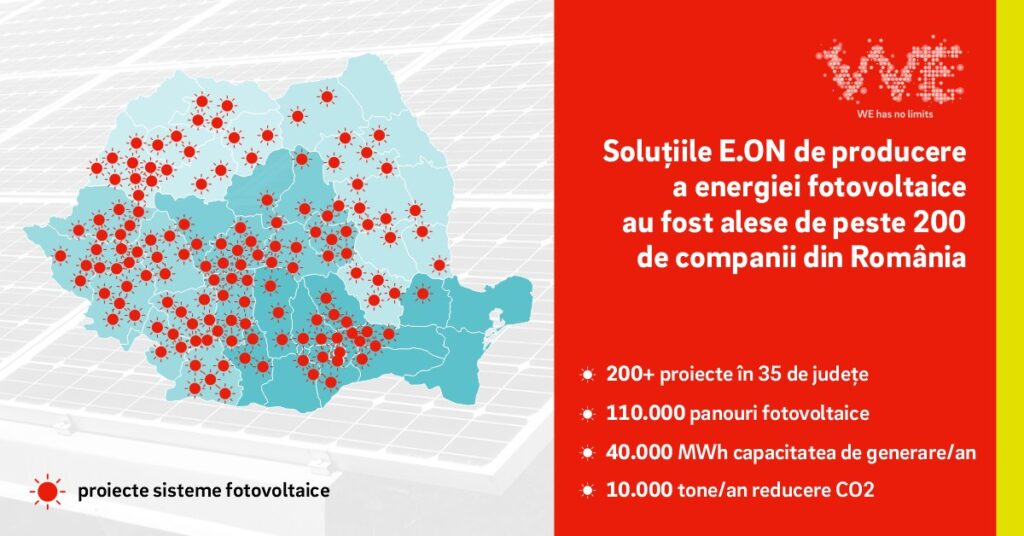 E.ON Energie România a încheiat, din 2018 și până în prezent, la nivel național parteneriate pentru realizarea și predarea la cheie a mai mult de 200 de centrale electrice fotovoltaice, pentru tot atâtea companii, valoarea totală a proiectelor însumând peste 40 de milioane de euro.