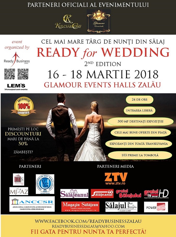 Echipa Ready Business Zalău aduce în faţa publicului interesat peste 40 de specialişti din toate domeniile necesare organizării unei nunţi reușite, care deja ți-au pregătit oferte corecte, reduceri foarte mari de până la 50% și multe alte surprize interesante. Vino să-i întâlnești și tu pe cei mai importanți expozanți din toată Transilvania. Vei asista la momente demonstrative, vei putea cere sfaturi avizate gratuite, vei aduna idei nenumărate în vederea personalizării evenimentului tău care pur și simplu trebuie să-i uimească pe toți invitații și nu doar pentru o zi sau pentru o noapte…