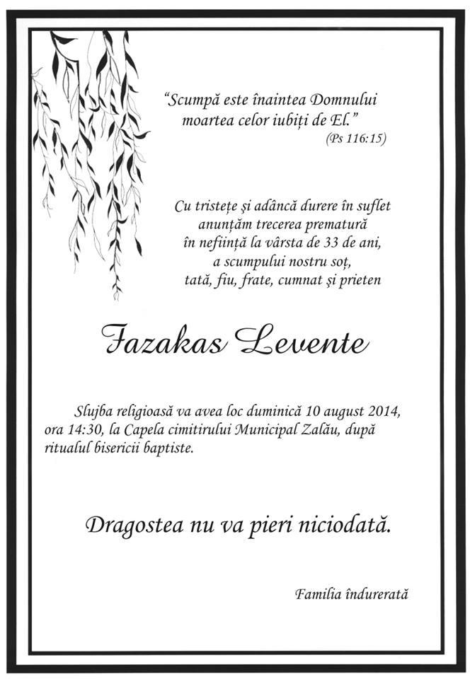 copil, familie, prieteni si toti cei care l-au conoscut. Cu sufletul sfasiat de durere, ii vor aduce un ultim omagiu, la Capela ortodoxa din municipiul Zalau, slujba de inmormantare va avea loc incepand cu ora 14:30.