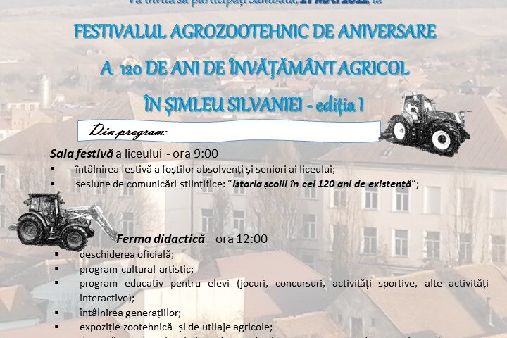 Evenimentul de aniversare a 120 de ani de învățământ agricol în Șimleu Silvaniei va reuni sâmbătă producătorii și meșteșugarii din Țara Silvaniei, se vor prezenta ofertele educaționale ale celor mai renumite universității și instituții de învățământ agricol din Transilvania. De asemenea un moment emoționant va fi întâlnirea generațiilor de absolvenți ai liceului.