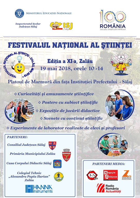 Sâmbătă, 19 mai 2018, la ora 10, pe platoul din faţa Prefecturii Judeţului Sălaj, elevi și profesori din mai multe județe vor participa la “ Festivalul Naţional al Ştiinţei-Zalău”, ediţia a XI-a.