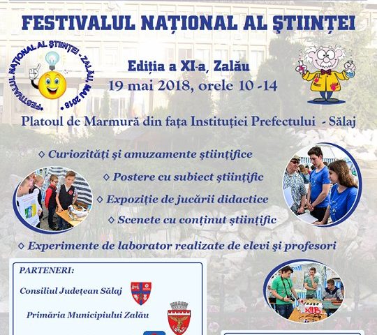 Sâmbătă, 19 mai 2018, la ora 10, pe platoul din faţa Prefecturii Judeţului Sălaj, elevi și profesori din mai multe județe vor participa la “ Festivalul Naţional al Ştiinţei-Zalău”, ediţia a XI-a.