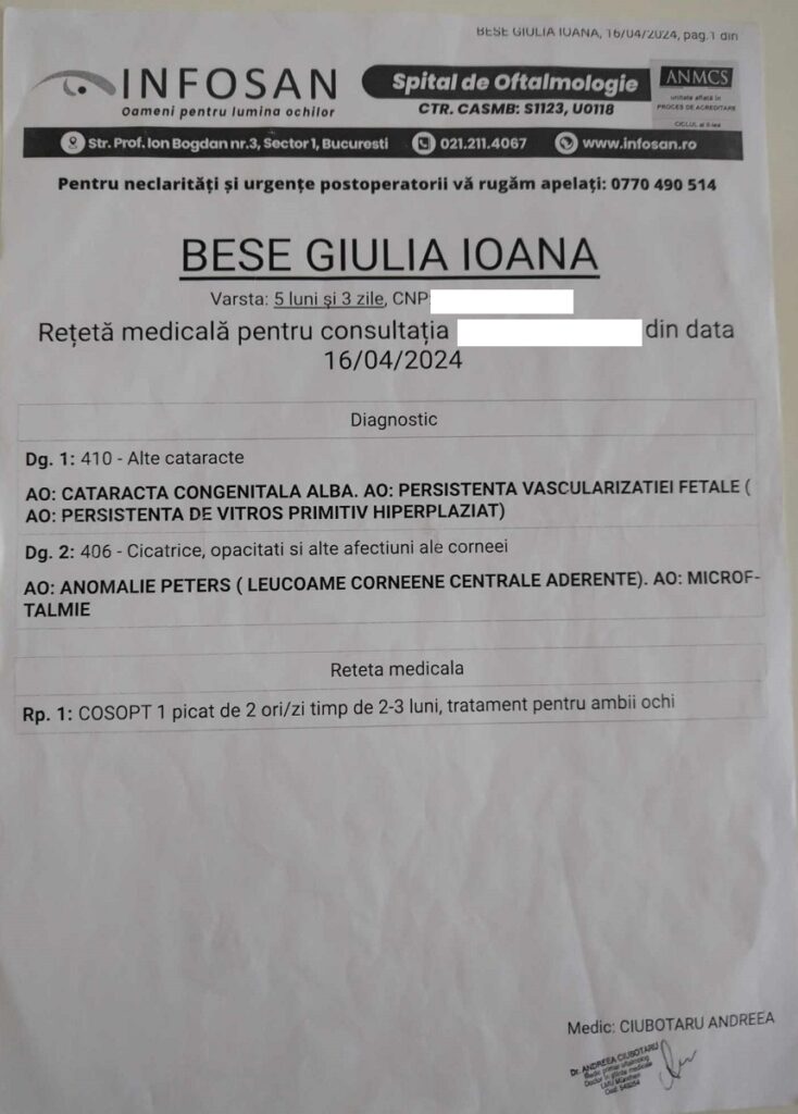 „Ea este micuța Giulia Ioana, care din păcate, s-a născut fără vedere. La vârsta de doar 3 luni a fost diagnosticată cu Cataractă congenitală malformată, iar singura soluție prin care își poate recăpăta vederea și totodată șansa de a fii un copil sănătos este să o operăm la o clinică privată din Belgia.