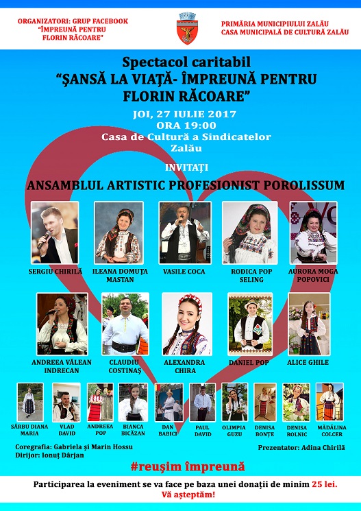 “împreună pentru Florin Răcoare”, în calitate de organizatori și Primăria Municipiului Zalău, alături de Casa Municipală de Cultură Zalău, în calitate de parteneri, vă invită la spectacolul caritabil “Șansă la viață – împreună pentru Florin Răcoare”, joi, 27 iulie 2017, începând cu ora 19:00, la Casa de Cultură a Sindicatelor Zalău.