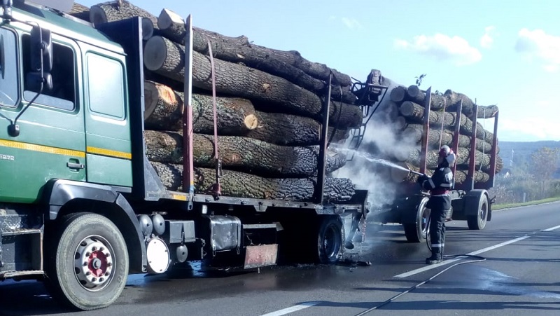 Camioneta tracta doua remorci incarcate cu lemne. Incendiul se manifesta la una dintre remorci si s-a propagat si la materialul lemnos.