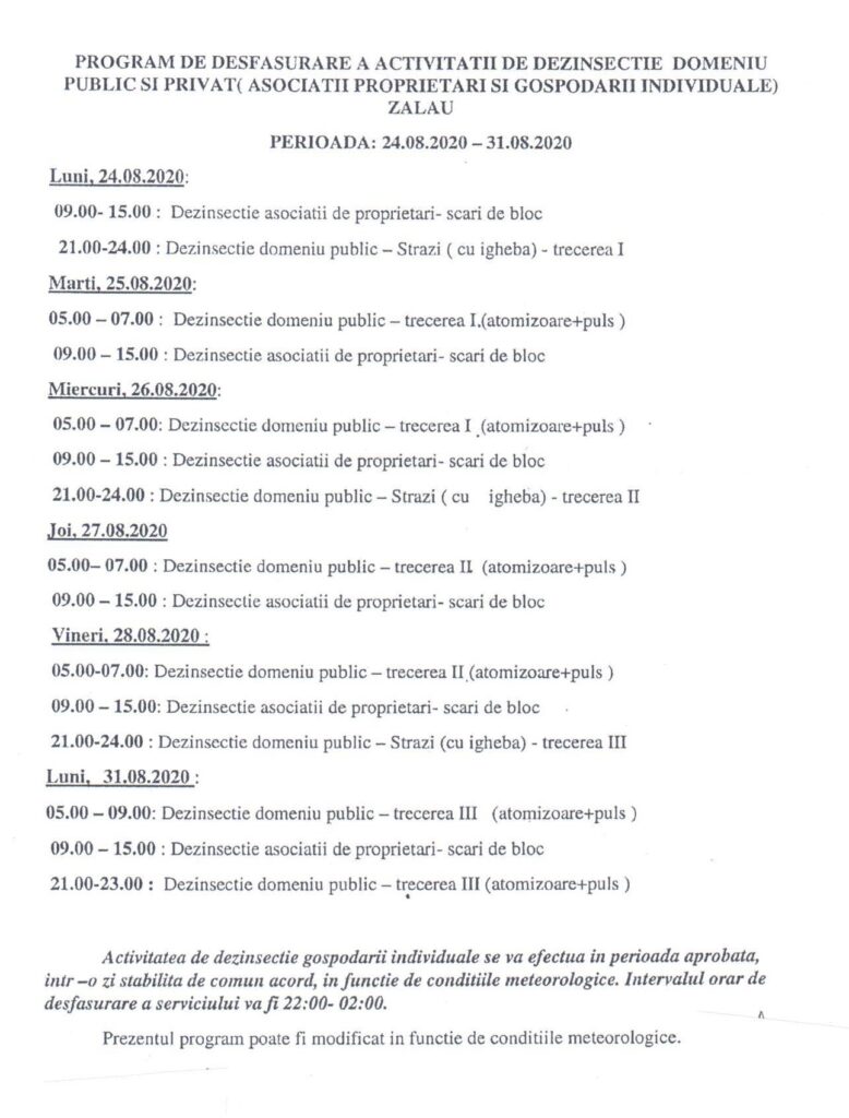 Pentru eficiență, acțiunea de dezinsecție pe domeniul public va fi desfășurată în intervalul orar 5.00-7.00 și 21.00-24.00. La scări de bloc, dezinsecția va fi efectuată în intervalul orar 9.00-15.00, iar la gospodării individuale în intervalul orar 22.00-02.00.