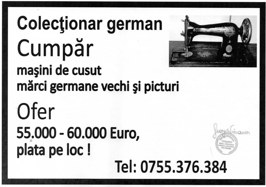 intenţia de cumpărare a maşinilor de cusut germane, oferind sume mari de bani (între 55.000 şi 60.000 de euro), cu plata pe loc, sume ce atrag oameni care au nevoie de bani şi sunt uşor de păcălit.