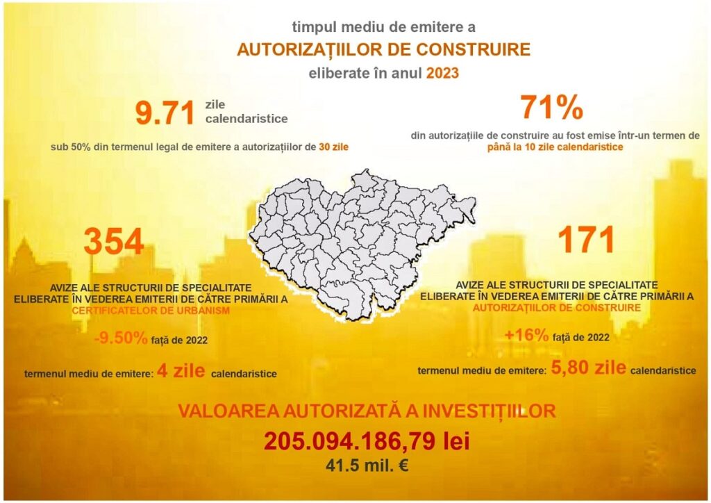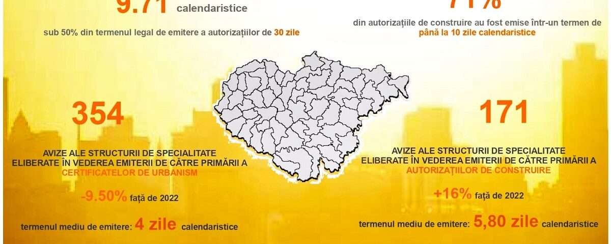 Termenul mediu de emitere a autorizațiilor de construire a fost de 9,71 zile calendaristice, în condițiile în care legea prevede ca aceste acte să fie eliberate în maximum 30 de zile de la data depunerii documentației complete.