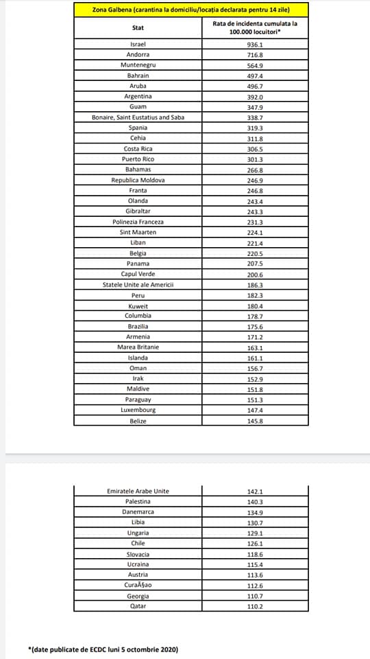 HOTĂRÂRE nr. 47 din 05.10.2020 privind aprobarea listei țărilor/zonelor de risc epidemiologic pentru care se instituie măsura carantinei asupra persoanelor care sosesc în România din acestea și stabilirea unor măsuri în domeniul sănătății publice