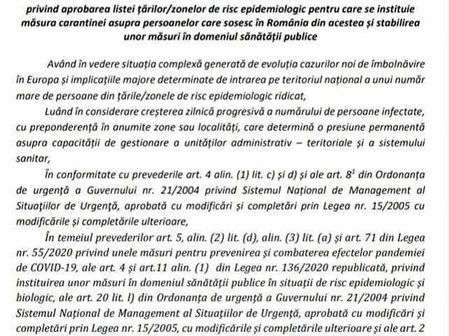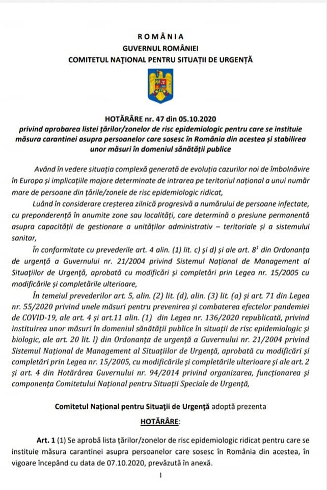 HOTĂRÂRE nr. 47 din 05.10.2020 privind aprobarea listei țărilor/zonelor de risc epidemiologic pentru care se instituie măsura carantinei asupra persoanelor care sosesc în România din acestea și stabilirea unor măsuri în domeniul sănătății publice