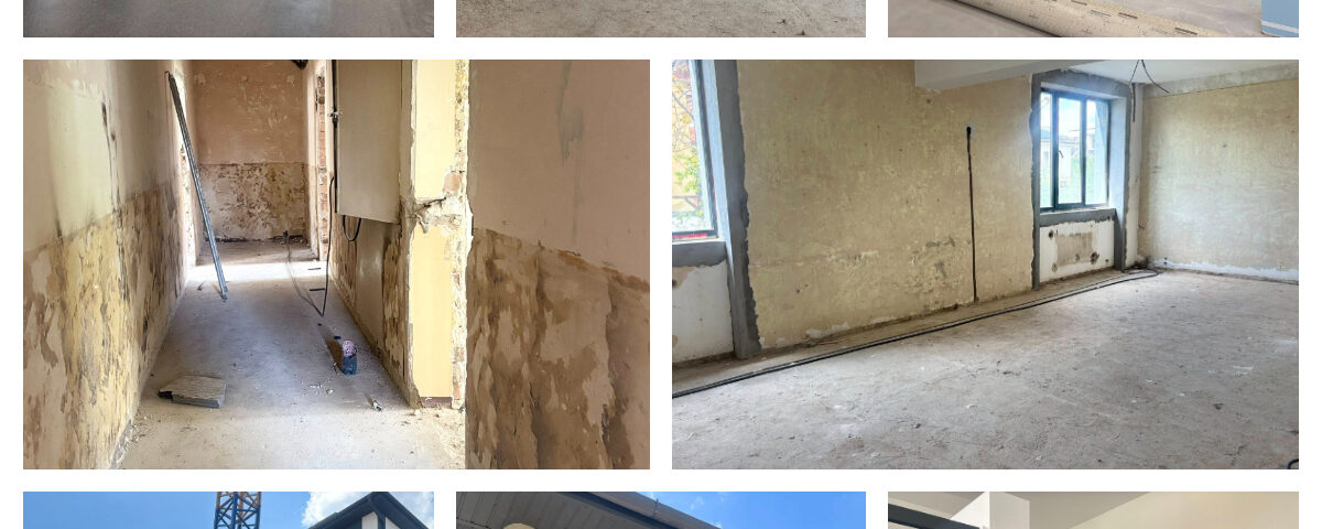La ambele clădiri finisajele exterioare sunt aproape finalizate, iar echipele de muncitori se ocupă cu lucrări de amenajare interioară.