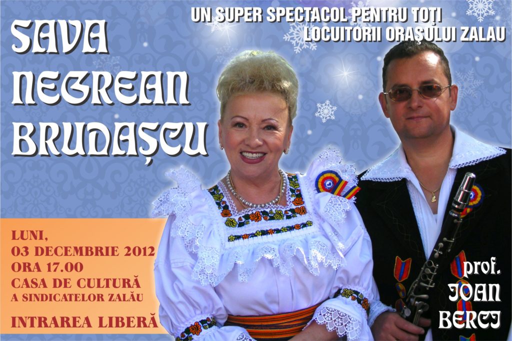 Luni 3 decembrie 2012, de la ora 17, va avea loc la Casa de Cultura a Sindicatelor din Zalau, cu intrare libera. Un super spectacol pentru toti locuitorii orasului Zalau oferit de catre Sava Negrean Brudascu si prof. Ioan Berci.