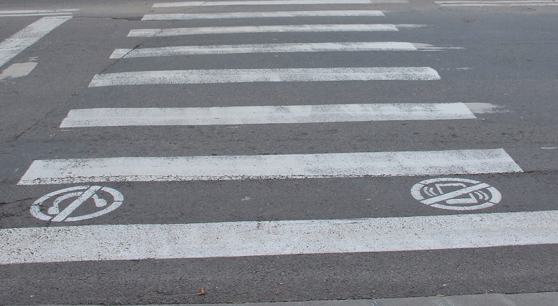 marcaje prin intermediul cărora pietonii și bicicliștii sunt averizați asupra faptului că folosirea telefonului mobil și a căștilor în timpul traversării străzii le poate pune viața în pericol.